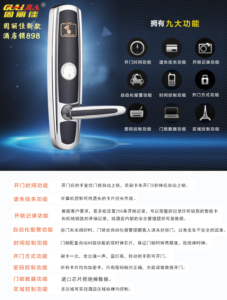 廣州錦盛商務(wù)酒店此次與我們固麗科技合作安裝了固麗佳GLJ-898FS的新款智能電子酒店門鎖,此款酒店鎖對每個細節(jié)精益求精,在莊嚴氣派中追求奢華優(yōu)雅,而融入現(xiàn)代設(shè)計手法后,則更貼近于實用性。其豪華的氣質(zhì)更是奢華與尊貴的象征,是各大星級酒店賓館首選。固麗佳酒店鎖可靠的質(zhì)量與完善的售后服務(wù)是各大酒店安裝智能門鎖的首要選擇。